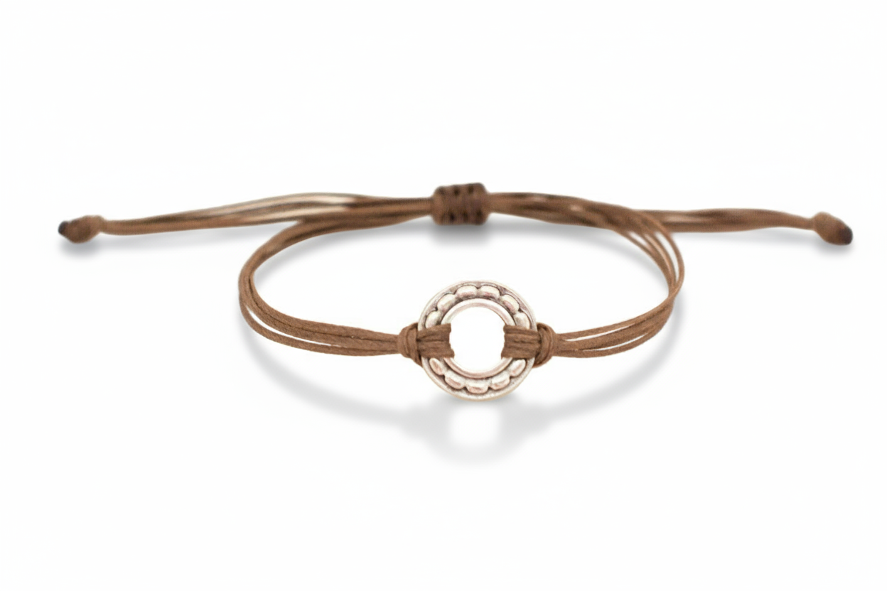 Bracelet for men - cord bracelet with a silver tone circle charm. The color of the cords is light brown and they are made of cotton, the charm is made of alloy. You can request a different cord color from the colors shown in the last picture. Closure: adjustable sliding knot.
