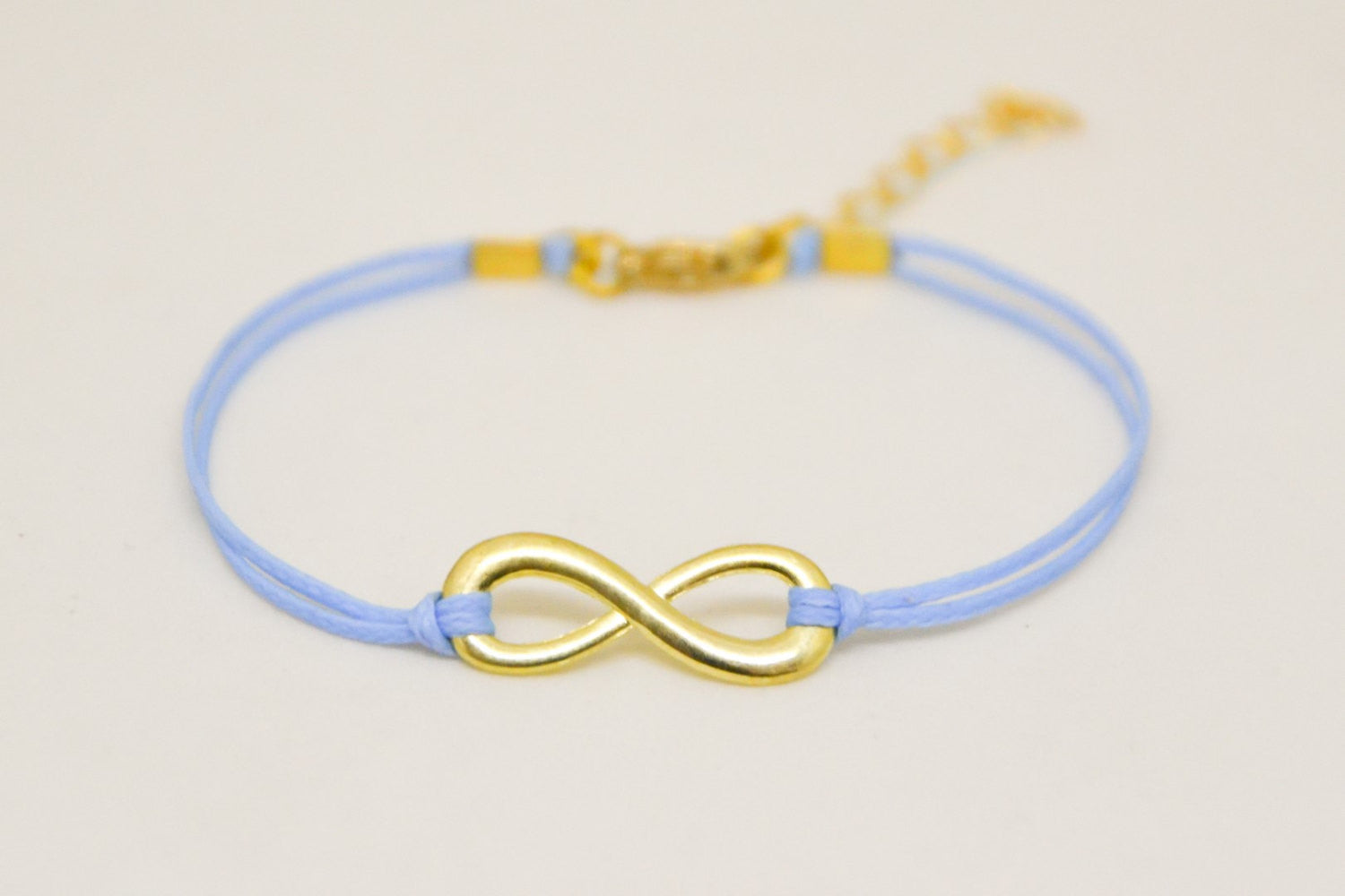 Infinity bracelet - cord bracelet with a gold tone infinity charm. The cord is light blue and made of cotton and the charm is made of alloy. The bracelet comes with an extension so it is adjustable. You can request a different cord color from the colors shown in the last picture.