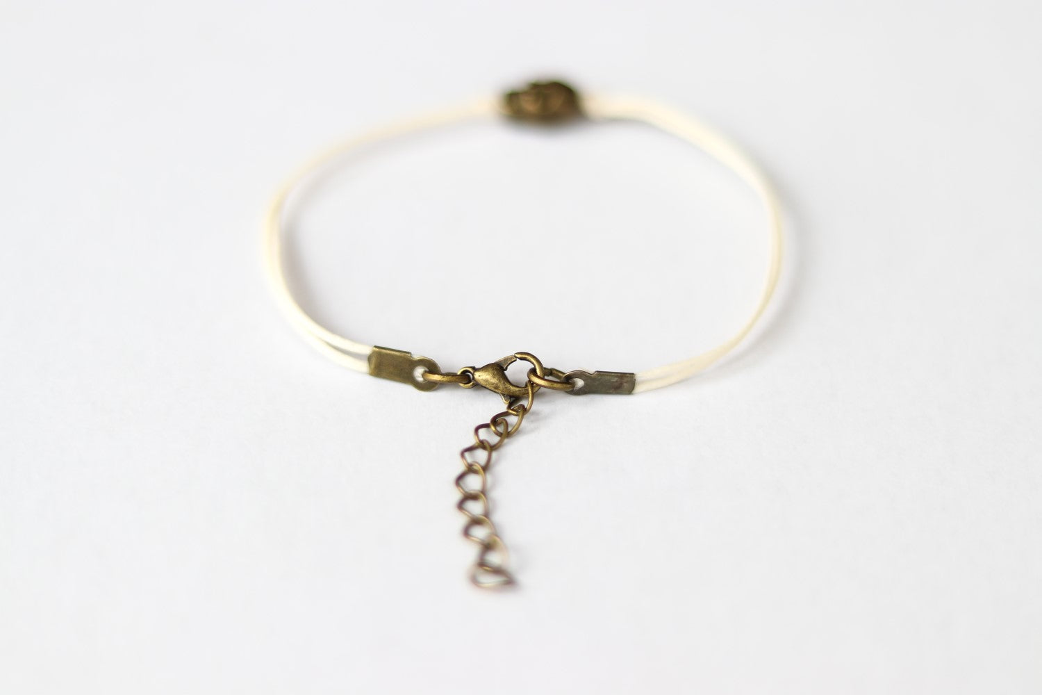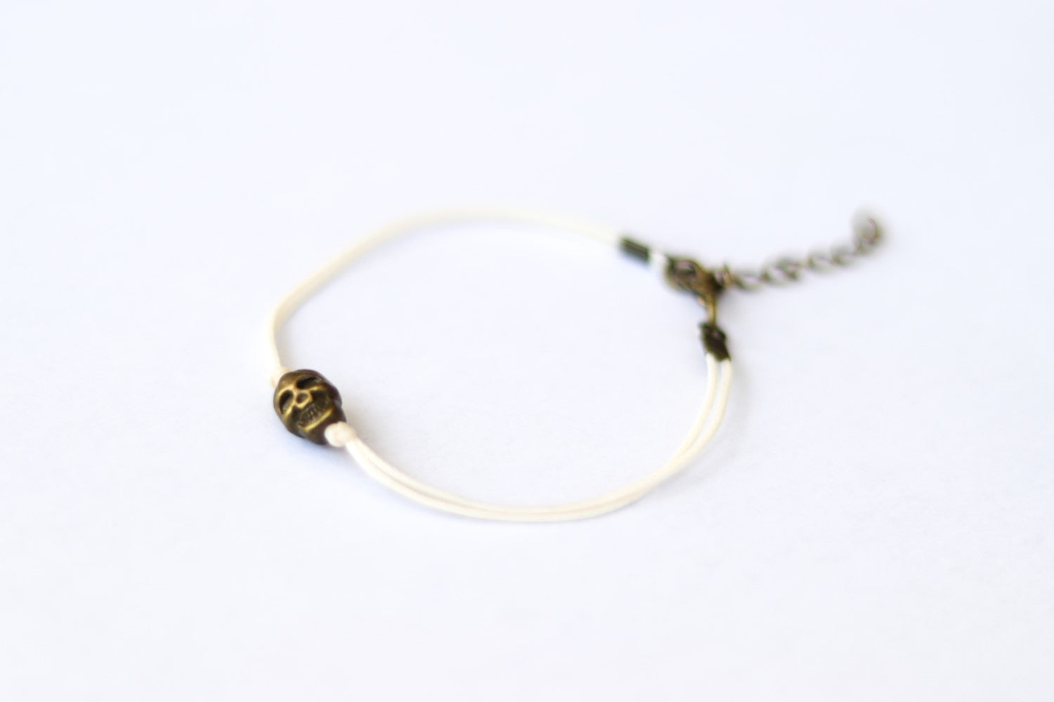 Skull bracelet - cord bracelet with a bronze tone skull charm bead. The color of the cord is beige and it is made of cotton. The bead is made of alloy. Clasp closure. The bracelet comes with an extension so it is adjustable.