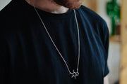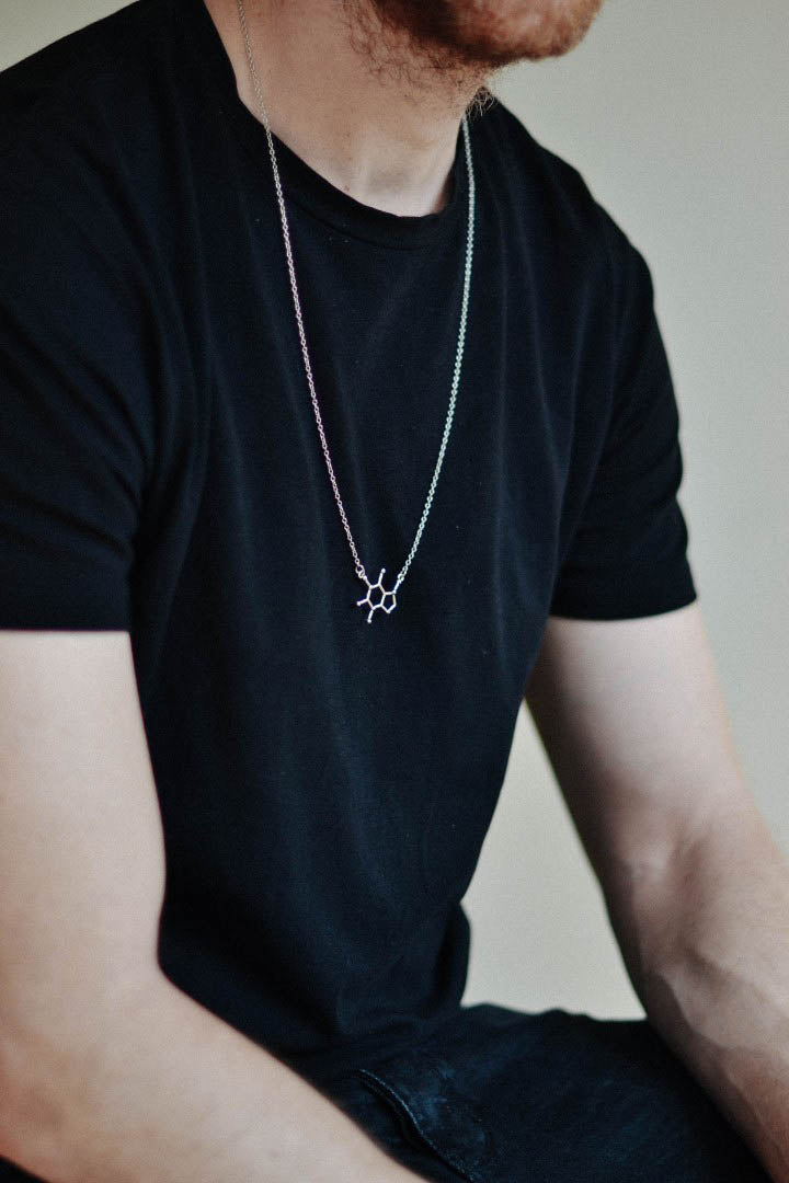 Caffeine necklace for men - men's necklace with a silver tone Caffeine Molecule pendant on a silver tone stainless steel chain and a clasp closure.