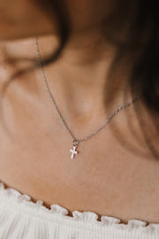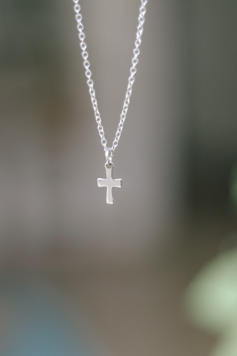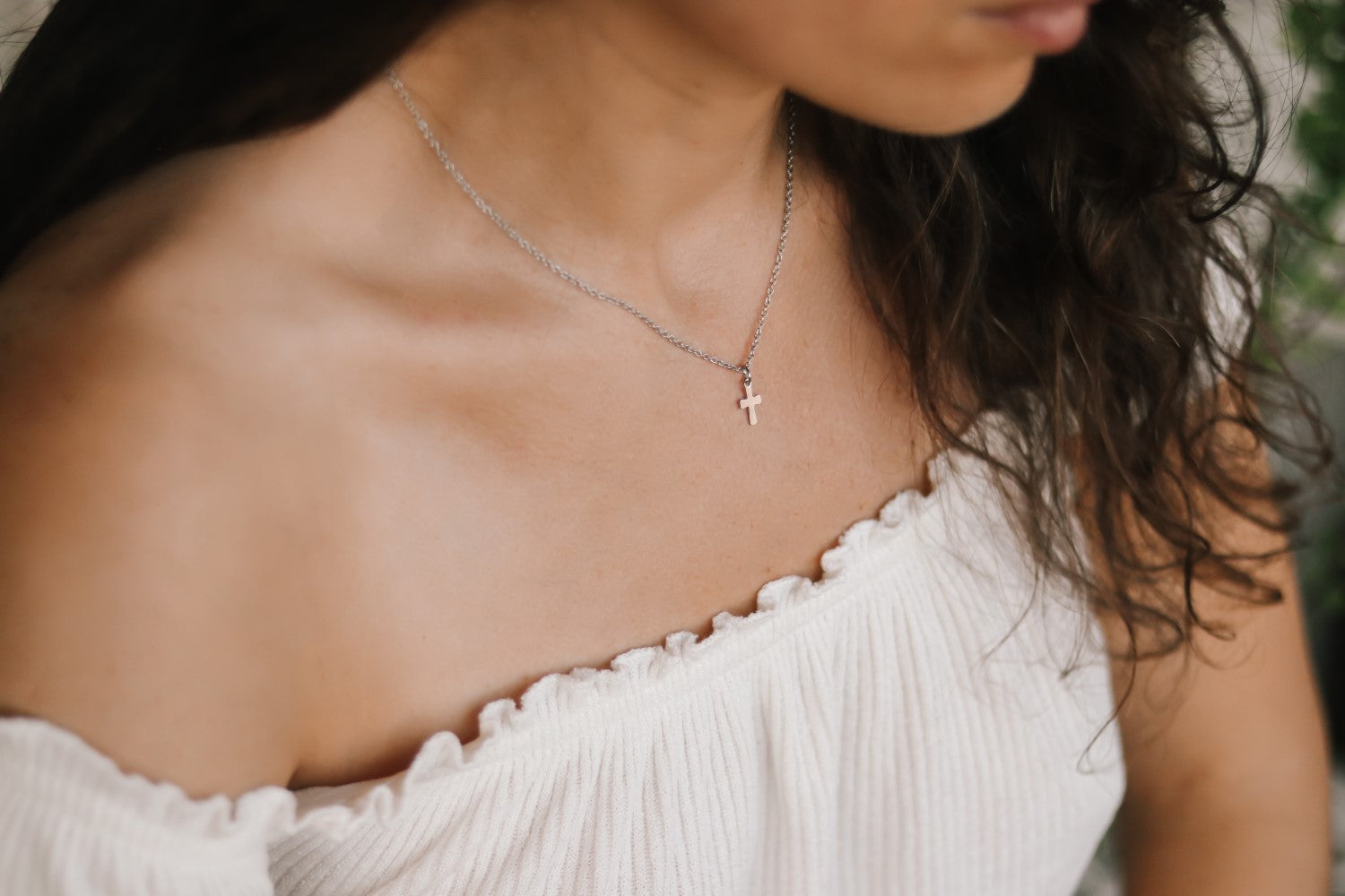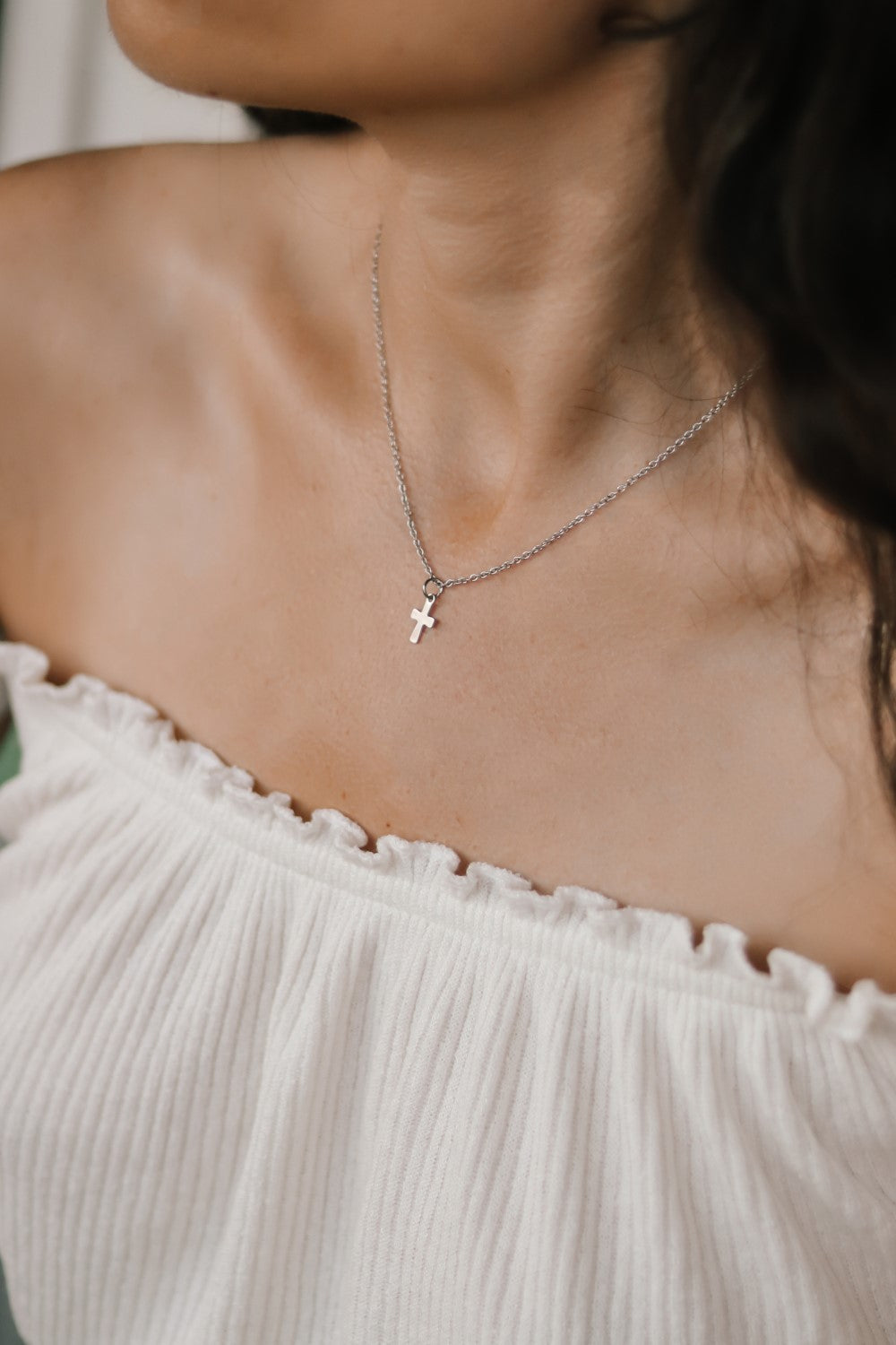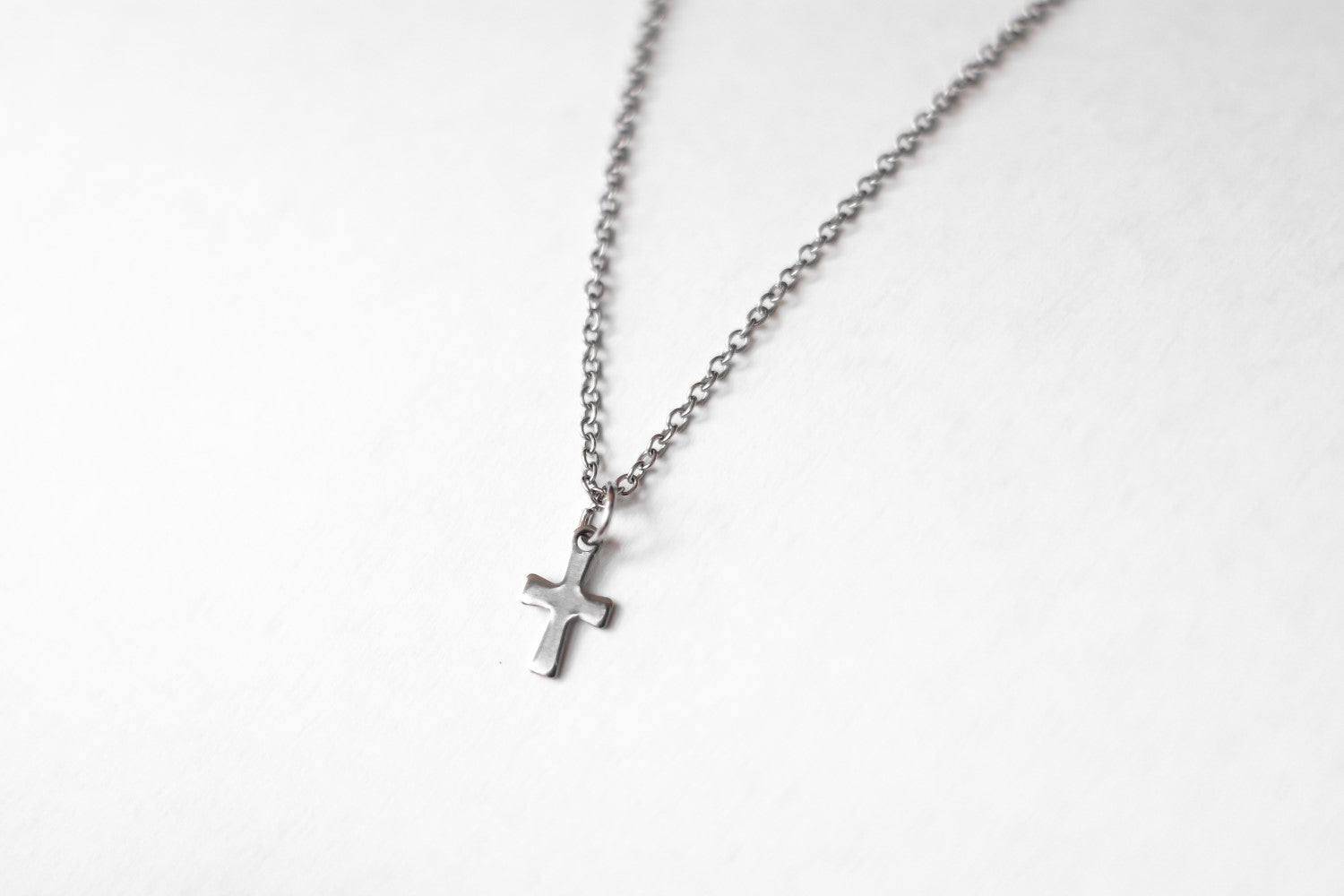 Cross necklace - minimalist necklace with a silver tone stainless steel chain and silver tone stainless steel small cross pendant. Waterproof necklace.
