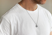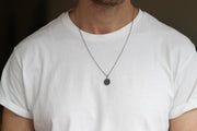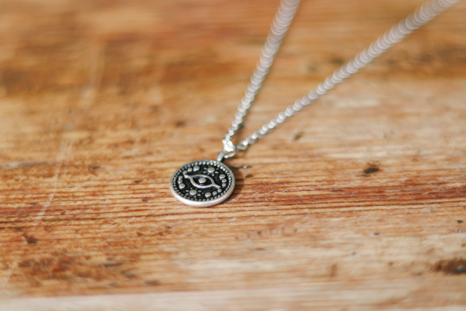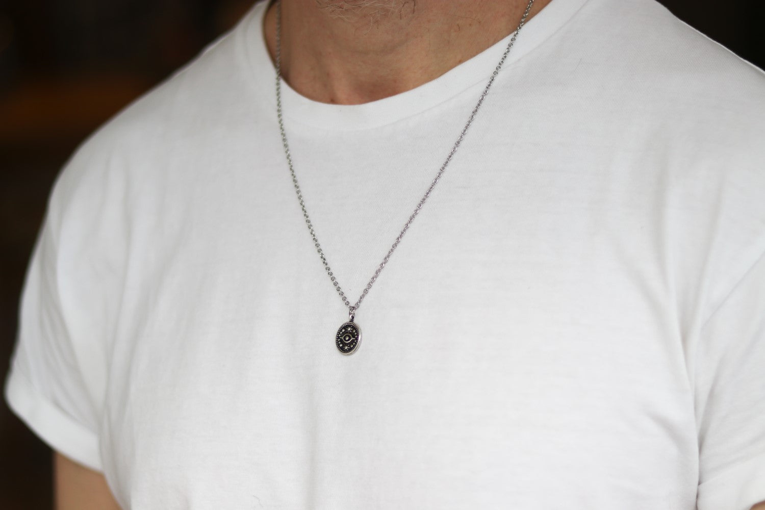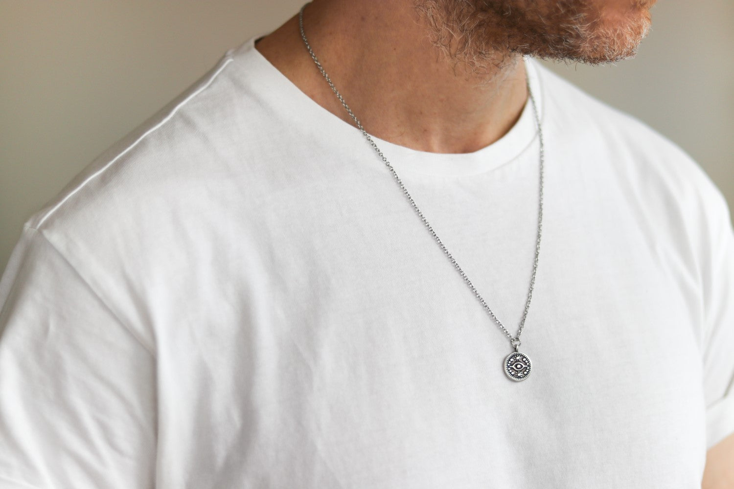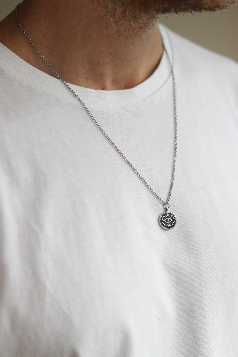 Necklace for men - men's necklace with a silver plated eye pendant on a stainless steel chain and a clasp closure.
