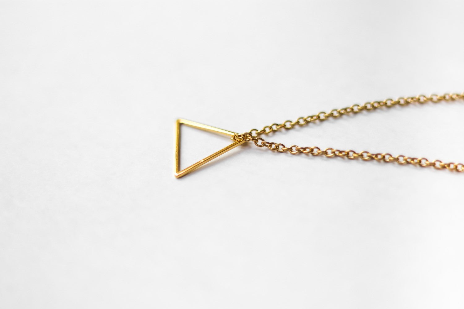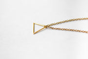 Triangle necklace - minimalist necklace with a gold tone stainless steel chain and gold tone stainless steel upside-down outlined triangle pendant.