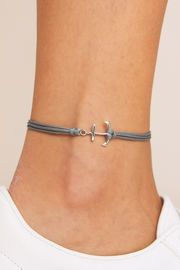 Anchor anklet for women, silver plated charm, gray cotton cord, ankle bracelet gift for her
