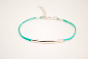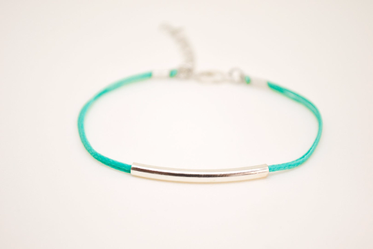 Silver bar bracelet - cord bracelet with a silver plated tube charm. The cord is gray and made of cotton and the tube is silver plated. The bracelet come with an extension so it is adjustable. Clasp closure. You can request a different cord color from the colors shown in the last picture.