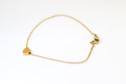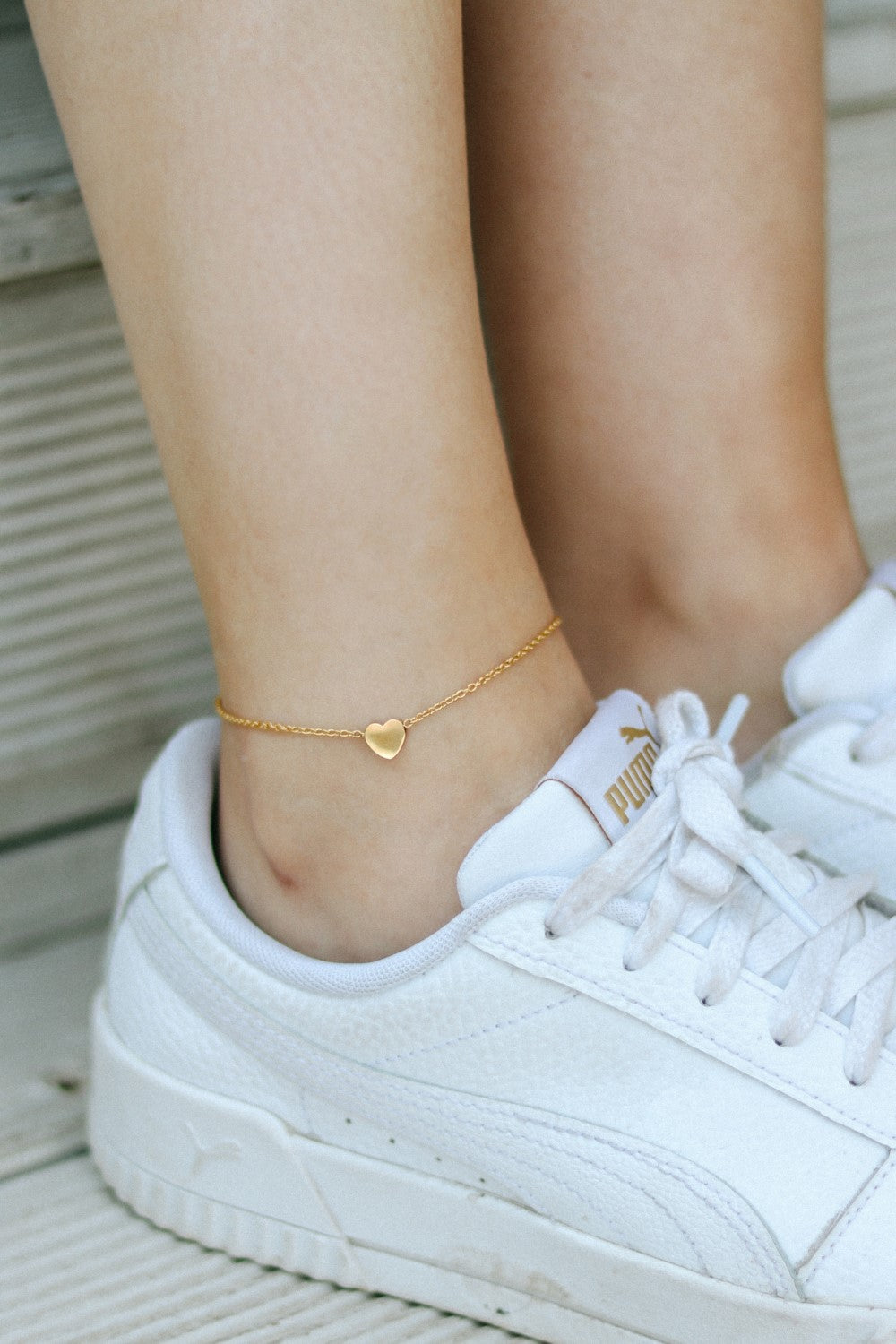 A minimalist heart anklet with a tiny heart bead charm on a gold tone stainless steel chain. Clasp closure.