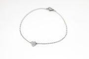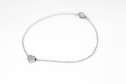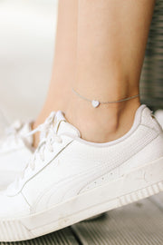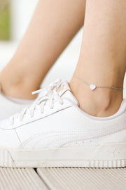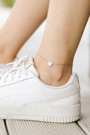 A minimalist heart anklet with a tiny heart bead charm on a silver tone stainless steel waterproof chain. Clasp closure.