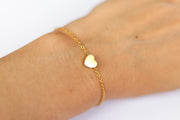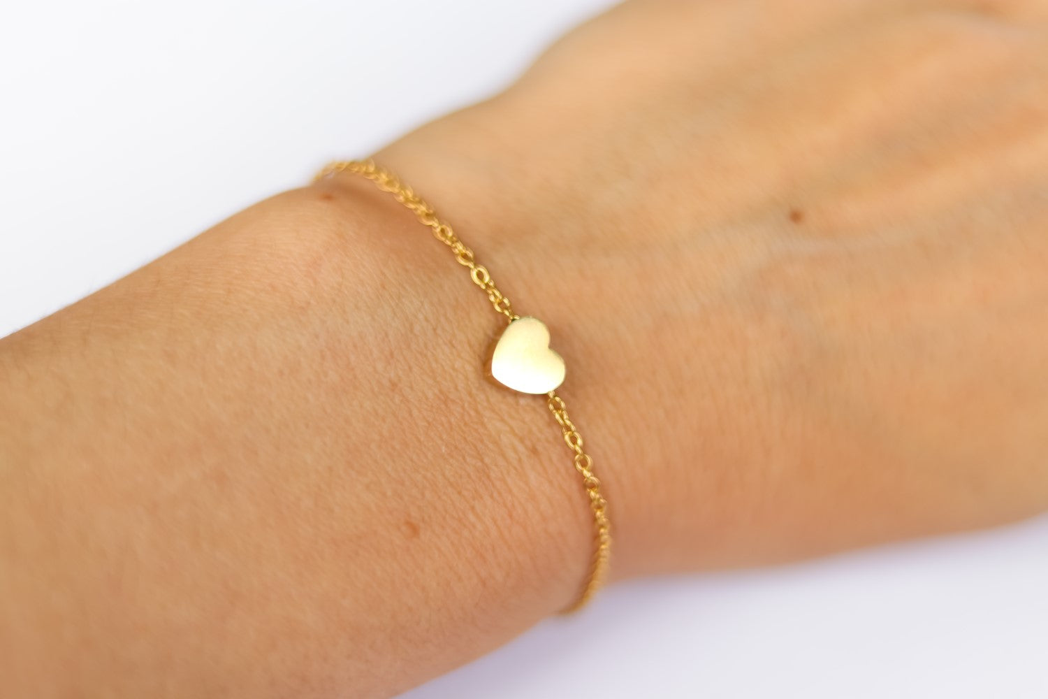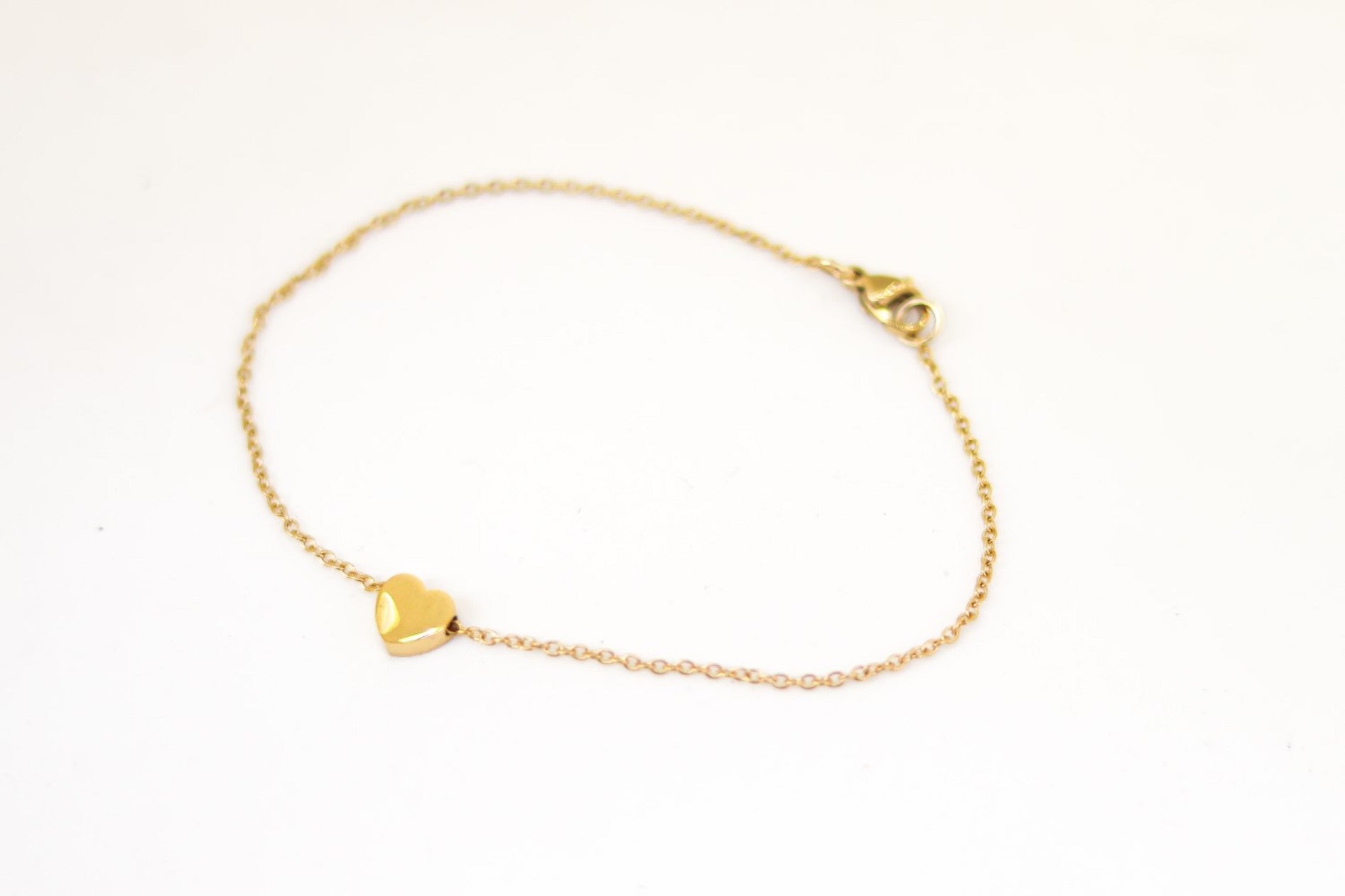 Heart bracelet with a small heart bead charm on a gold tone stainless steel chain. Clasp closure.