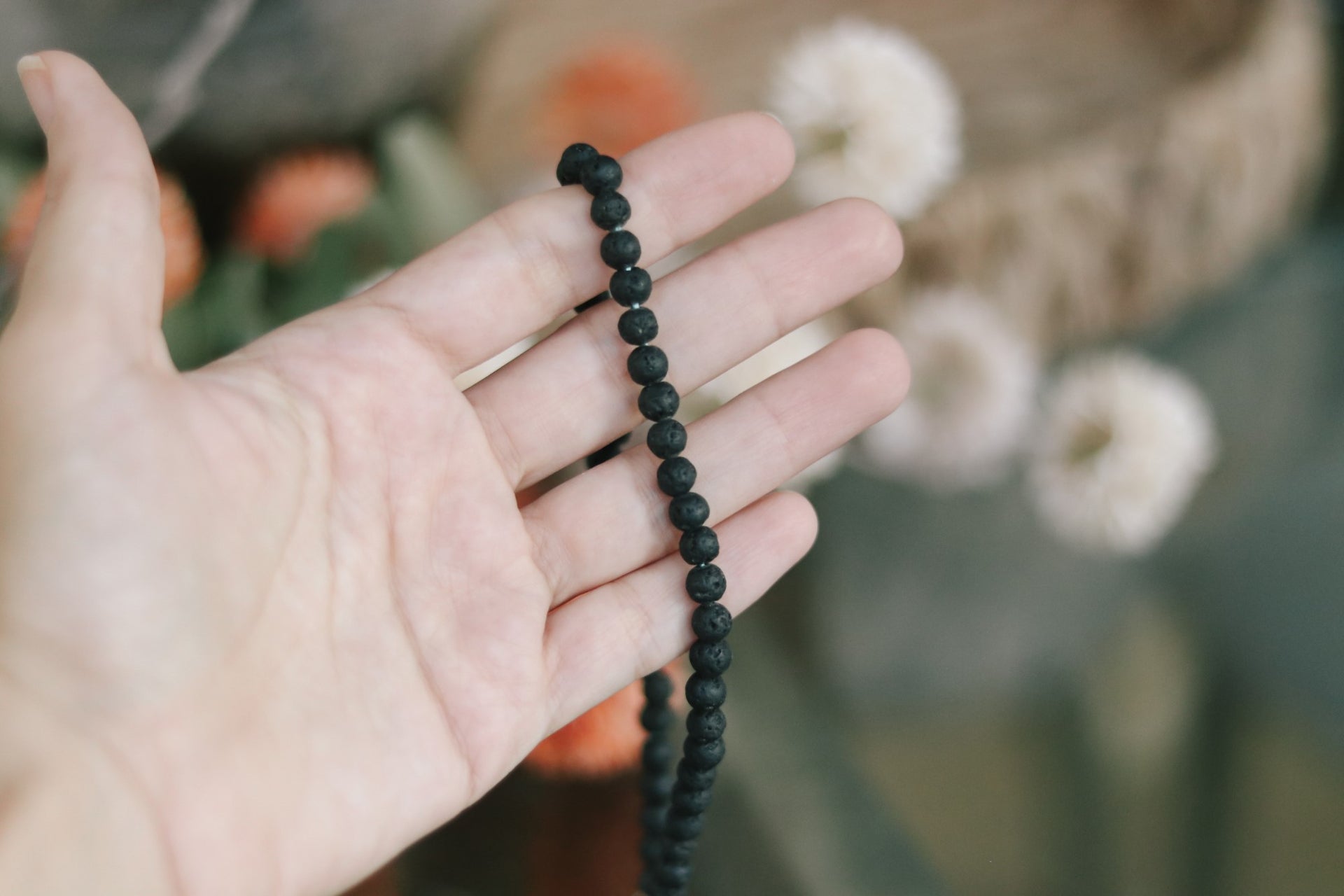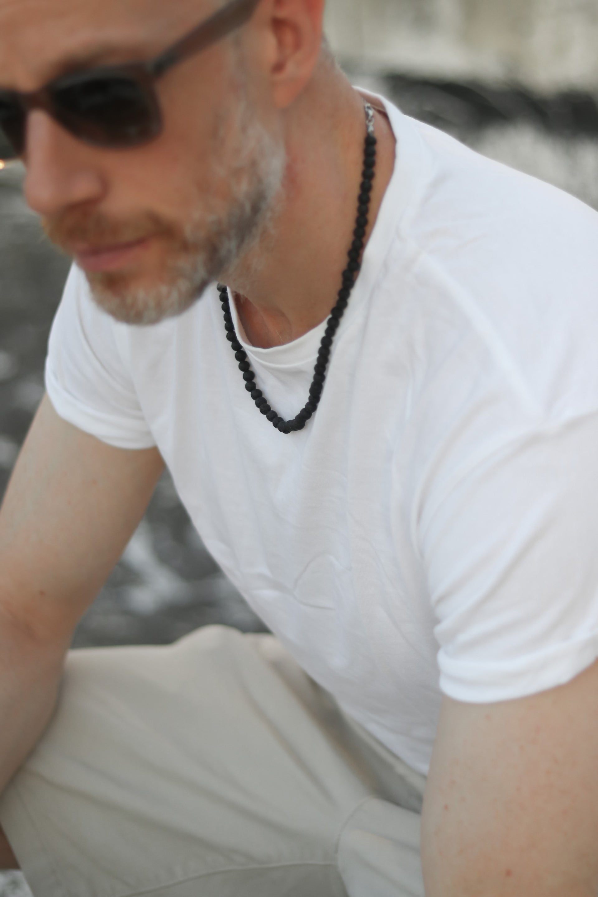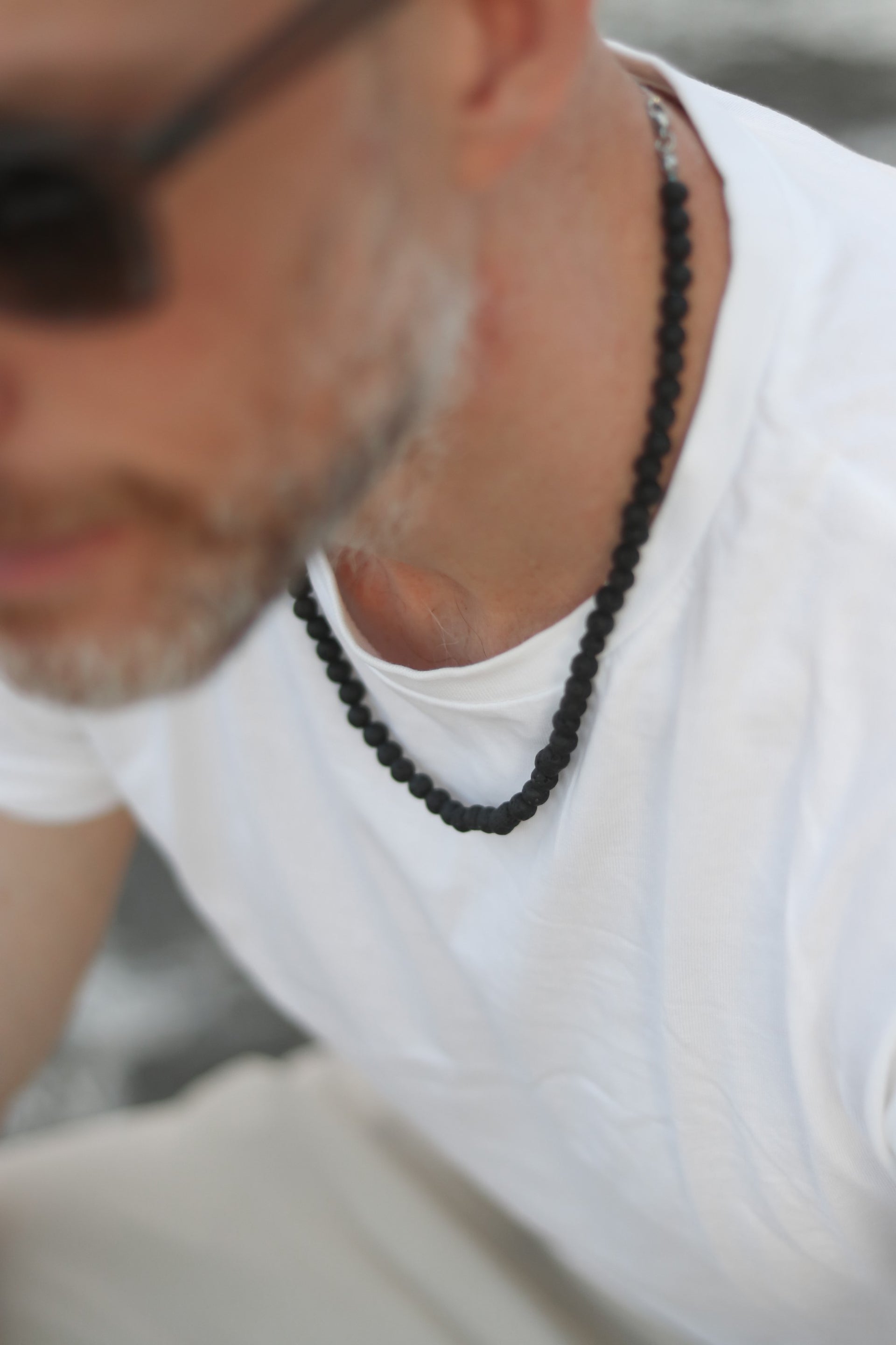 Lava stone beads necklace for men. The Lava stone is believed to reduce anxiety, bring emotional tranquillity and calmness. Also, the lava stone is believed to cleanse negative thoughts.