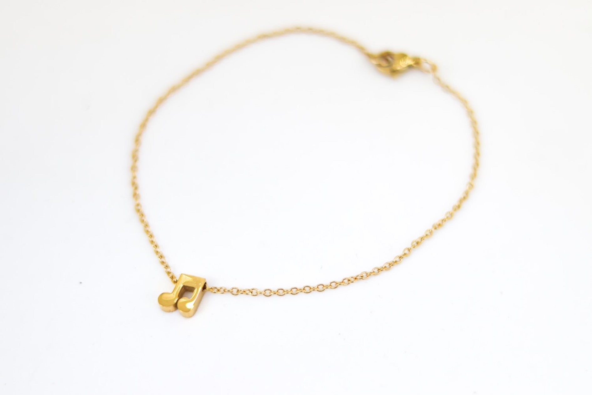 A minimalist music note bracelet with a tiny music note bead charm on a gold tone stainless steel chain. Clasp closure.