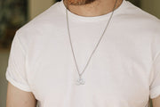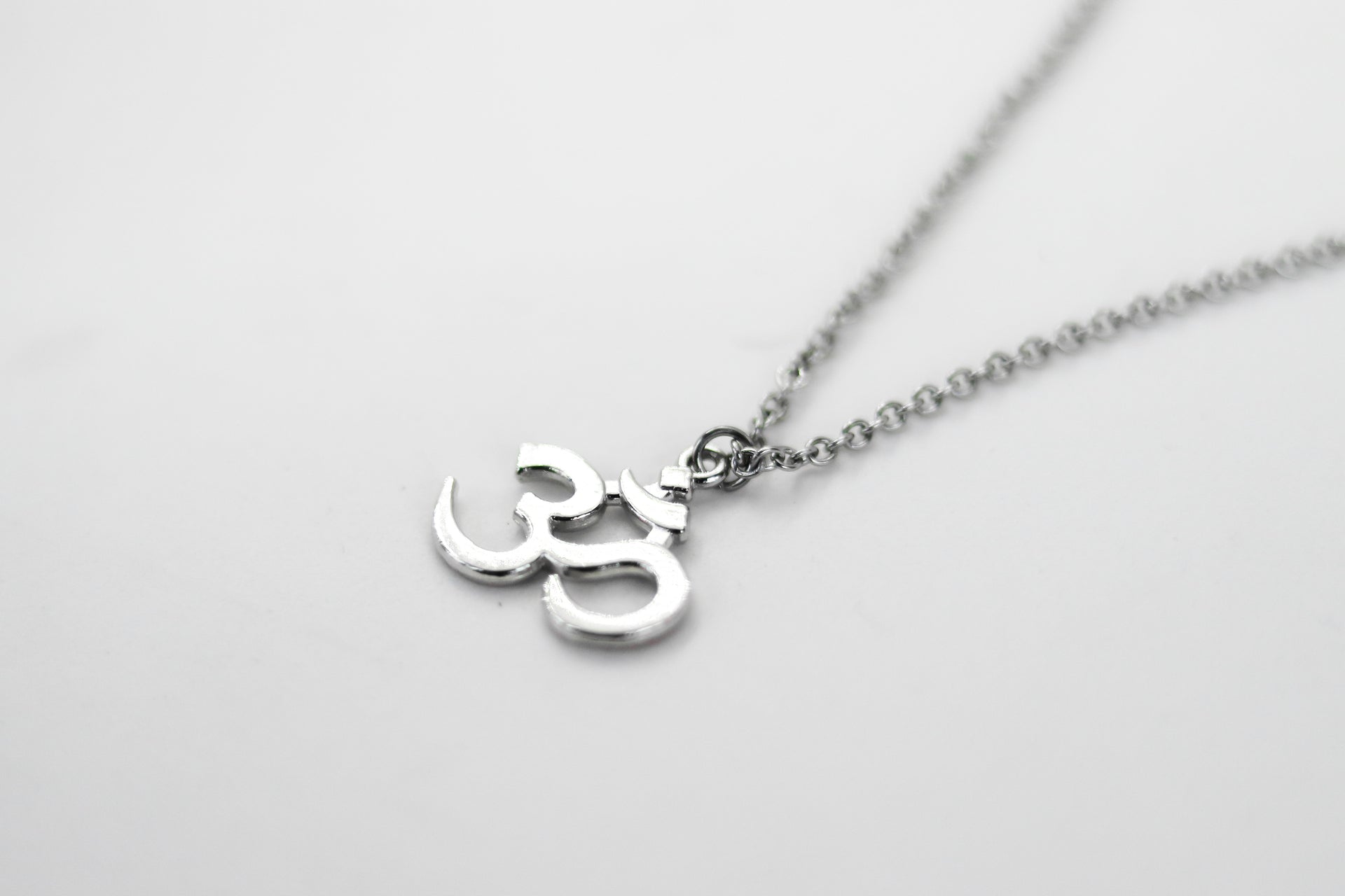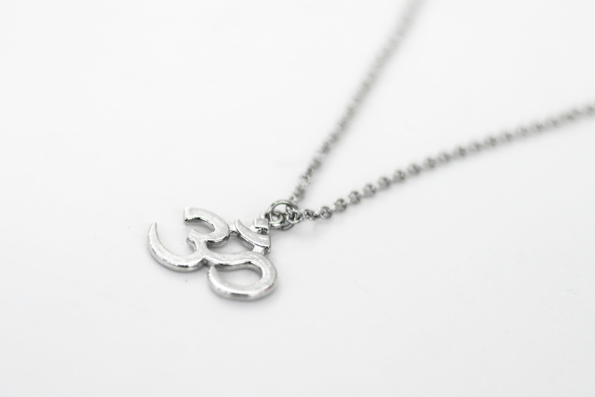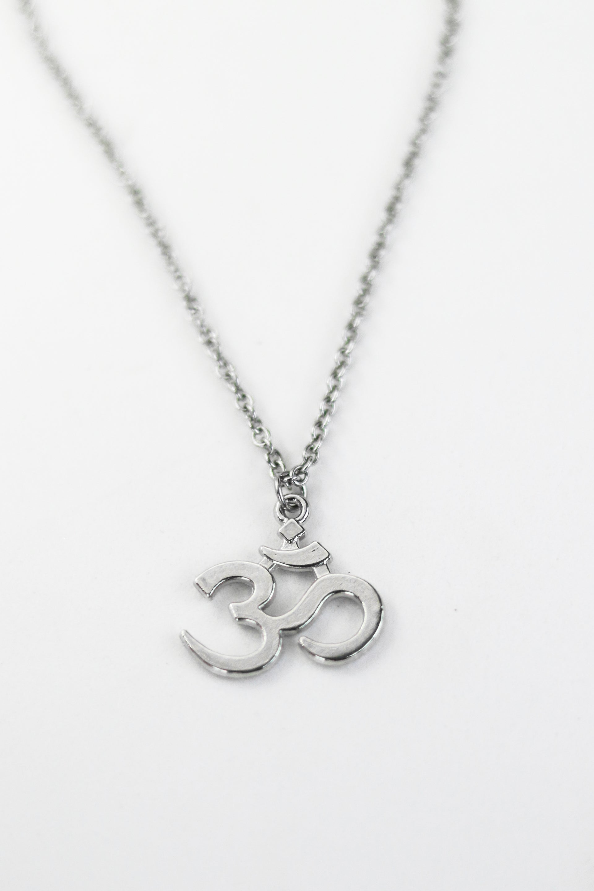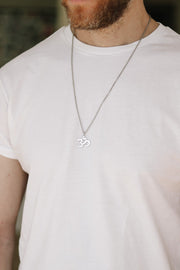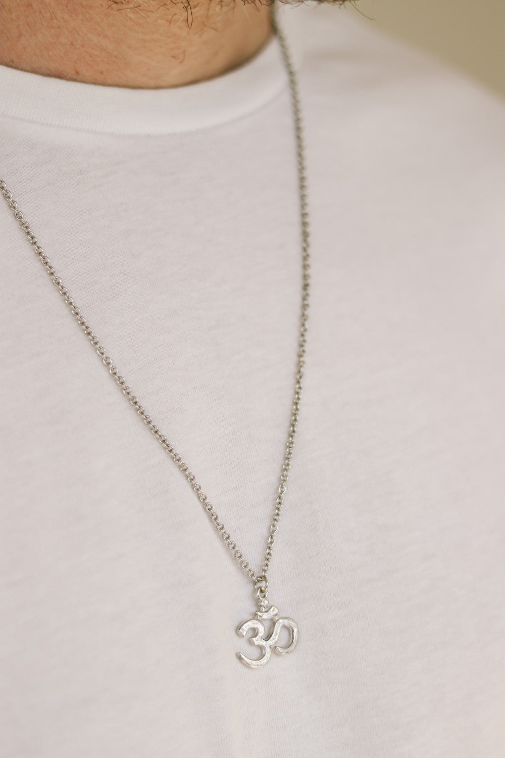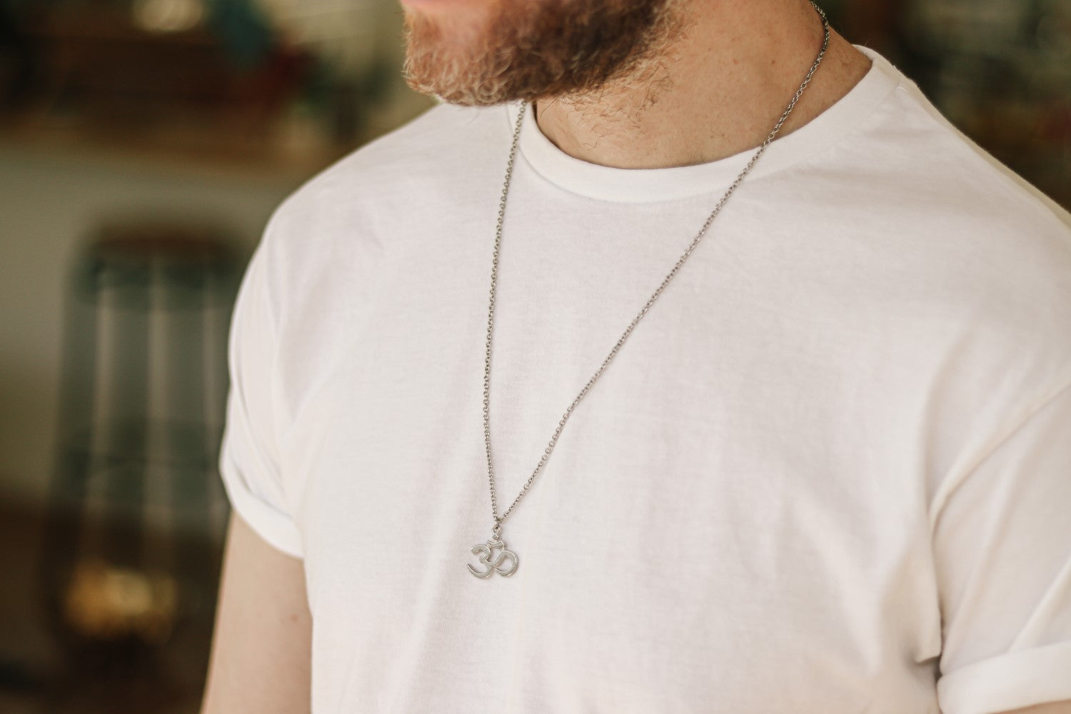 Om pendant necklace for men - men's necklace with a silver tone alloy Om pendant on a stainless steel chain and a clasp closure. (ॐ - The Om is a Hindu Symbol of the Absolute)