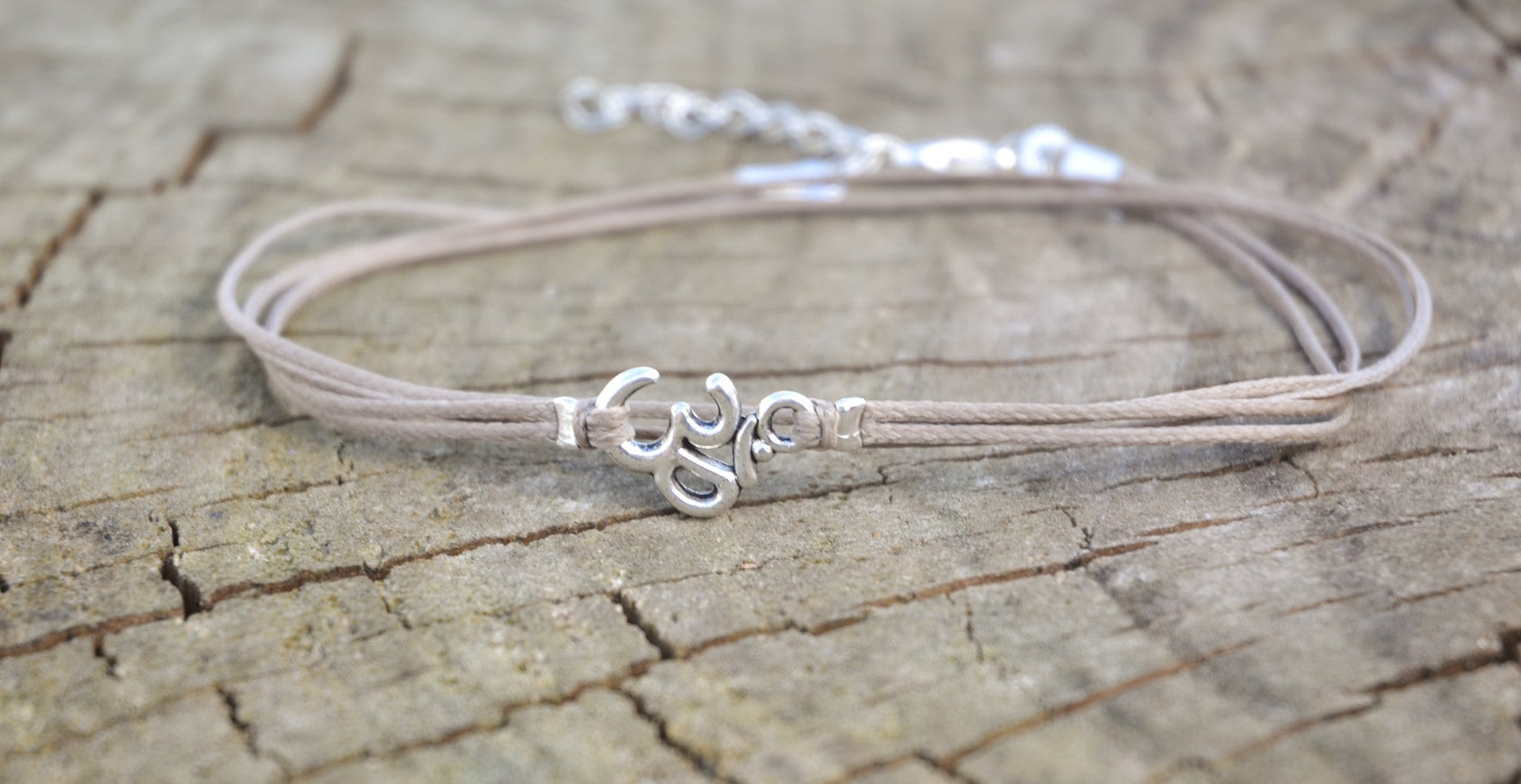 Om anklet - wrapped cord anklet with a silver tone Om charm - ॐ (The Om is a Hindu Symbol of the Absolute). The color of the cord is light brown and it is made of cotton. The Om charm is made of alloy. Clasp closure. The anklet comes with an extension so it is adjustable.