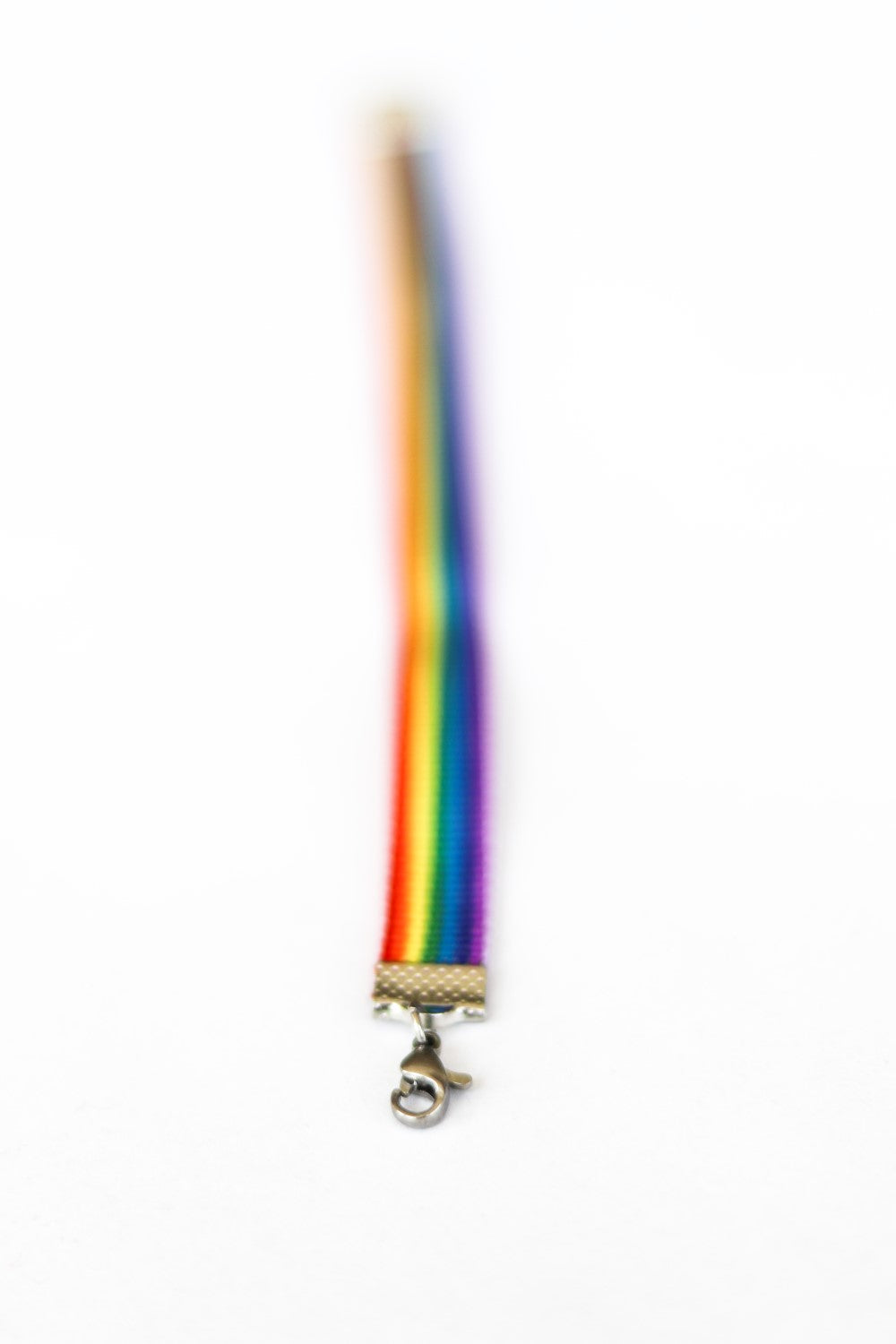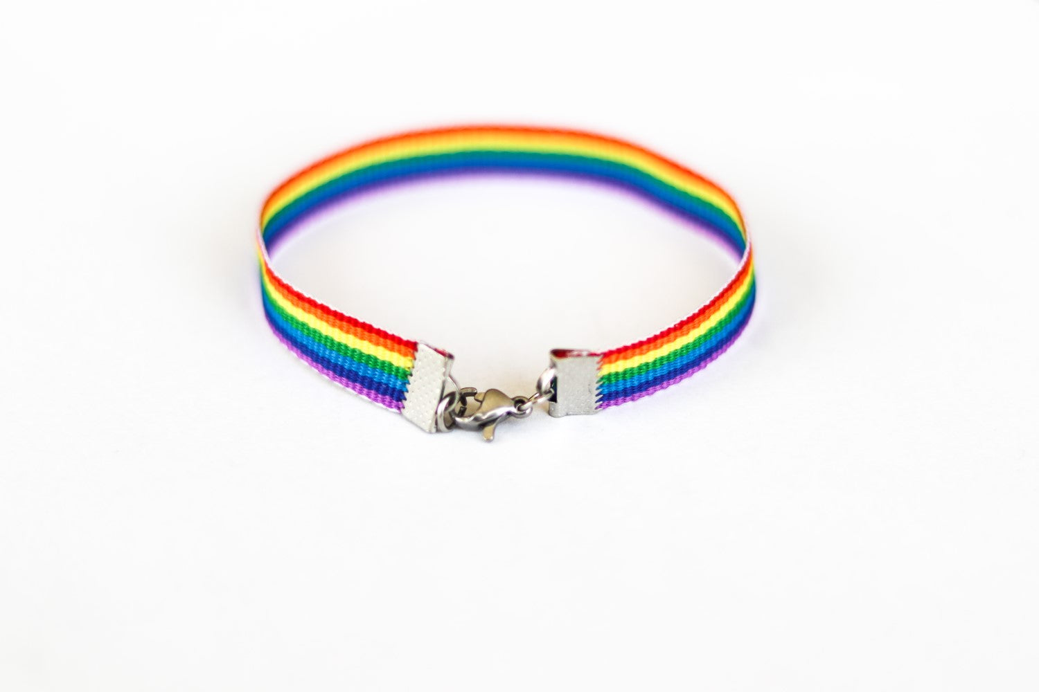 Pride ankle bracelet - strand anklet without a charm with one strap of 6 colors that represent the colors of the pride rainbow flag: red, orang, yellow, green, blue and purple, and it is made of Polyester. The width of the strap is 0.4 inches (10mm). Stainless steel clasp closure.