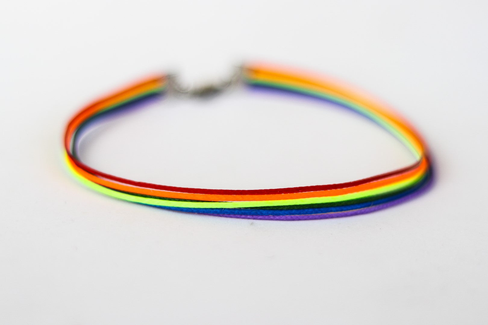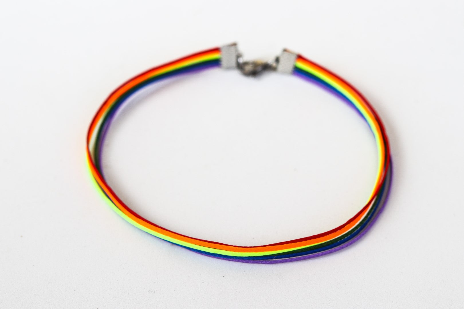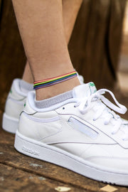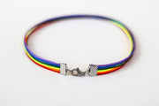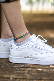 Pride ankle bracelet - cord anklet with six cords that represent the colors of the pride rainbow flag: red, orang, yellow, green, blue and purple, and they are made of cotton. Stainless steel clasp closure.