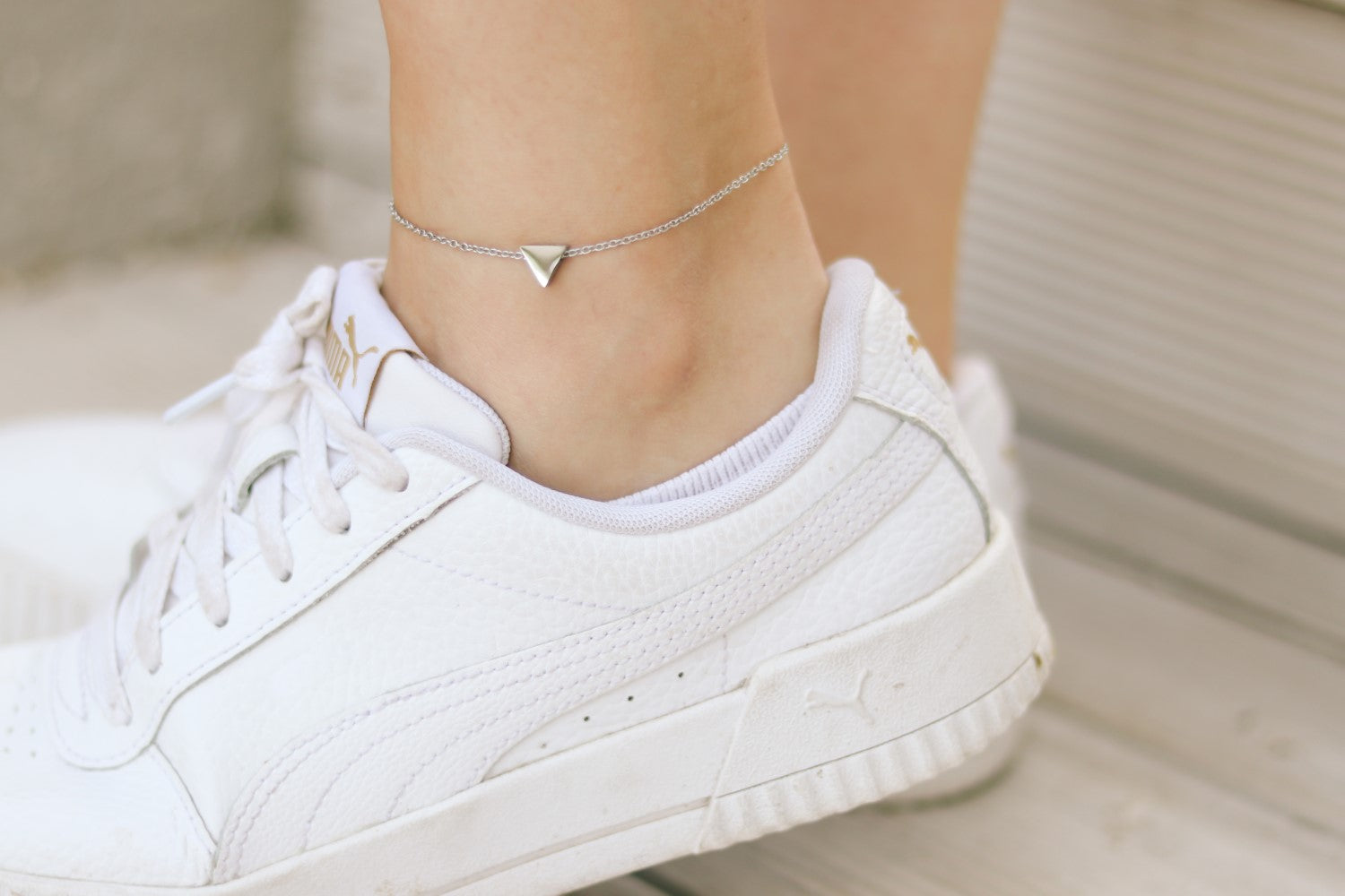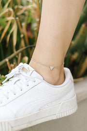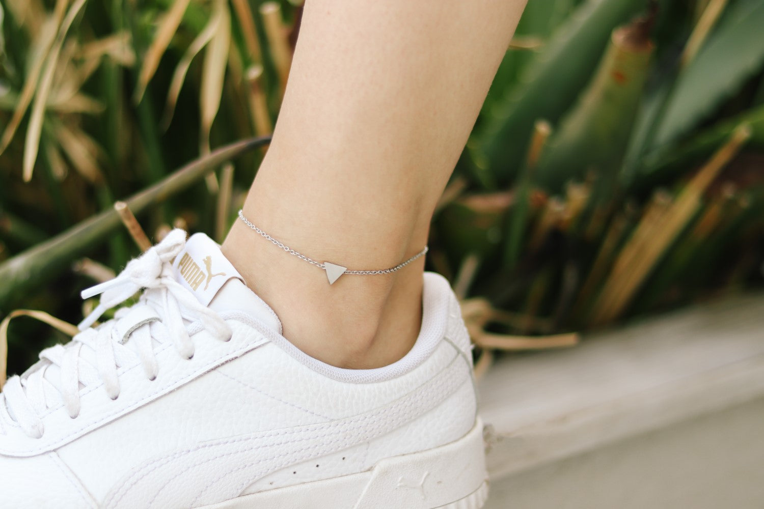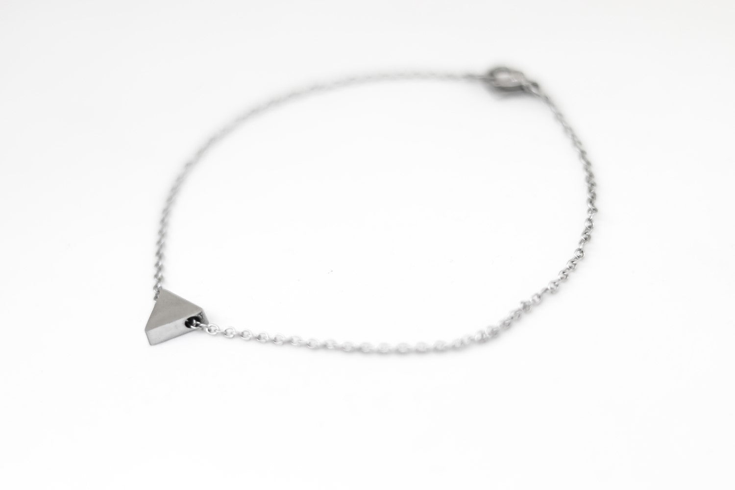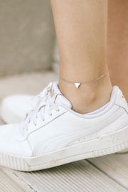 riangle anklet with a tiny Triangle bead charm on a silver tone stainless steel waterproof chain. Clasp closure.