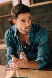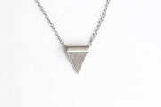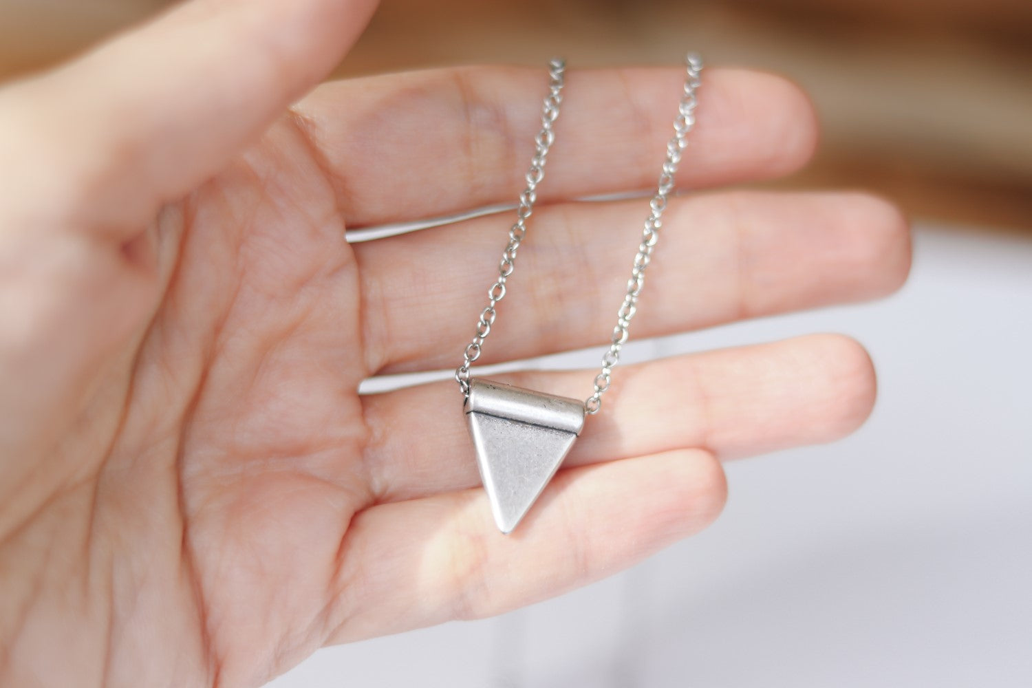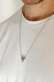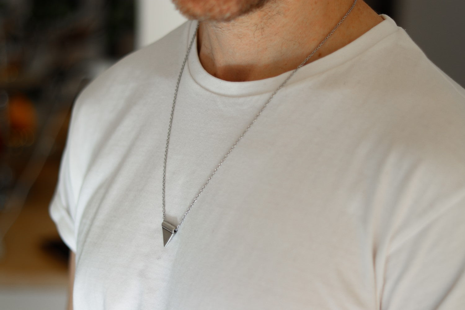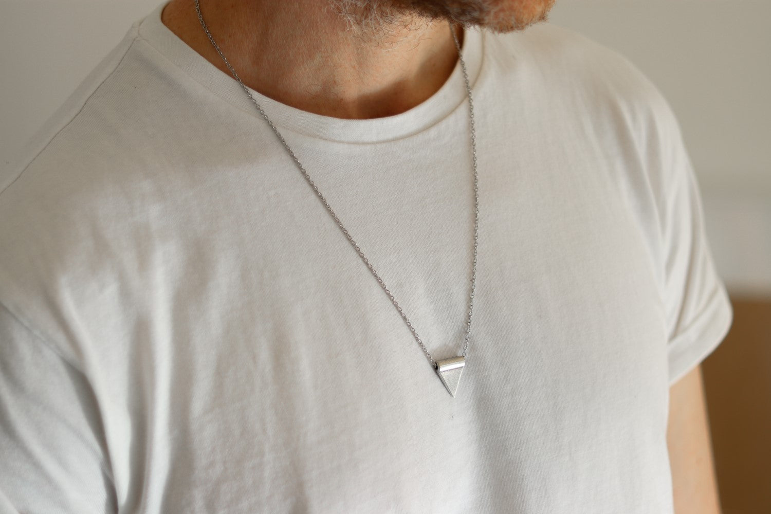 Pendant necklace for men - men's necklace with a silver plated triangle pendant on a stainless steel chain and a clasp closure.