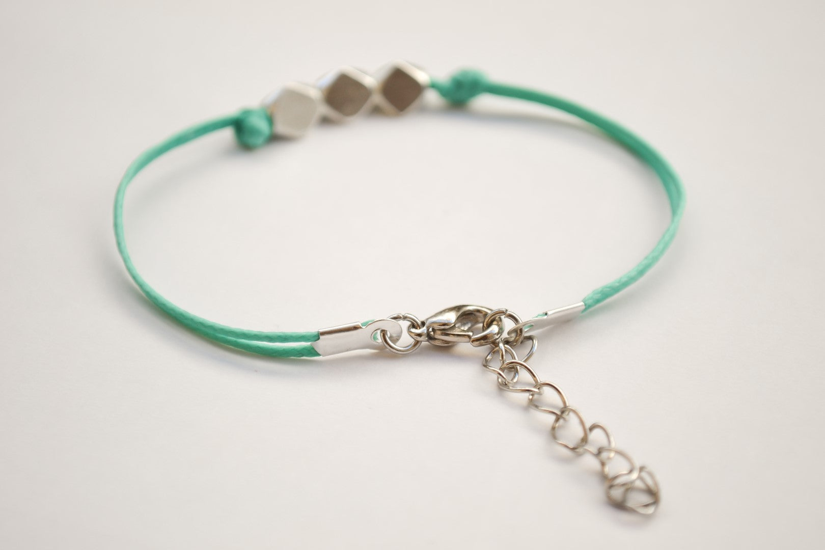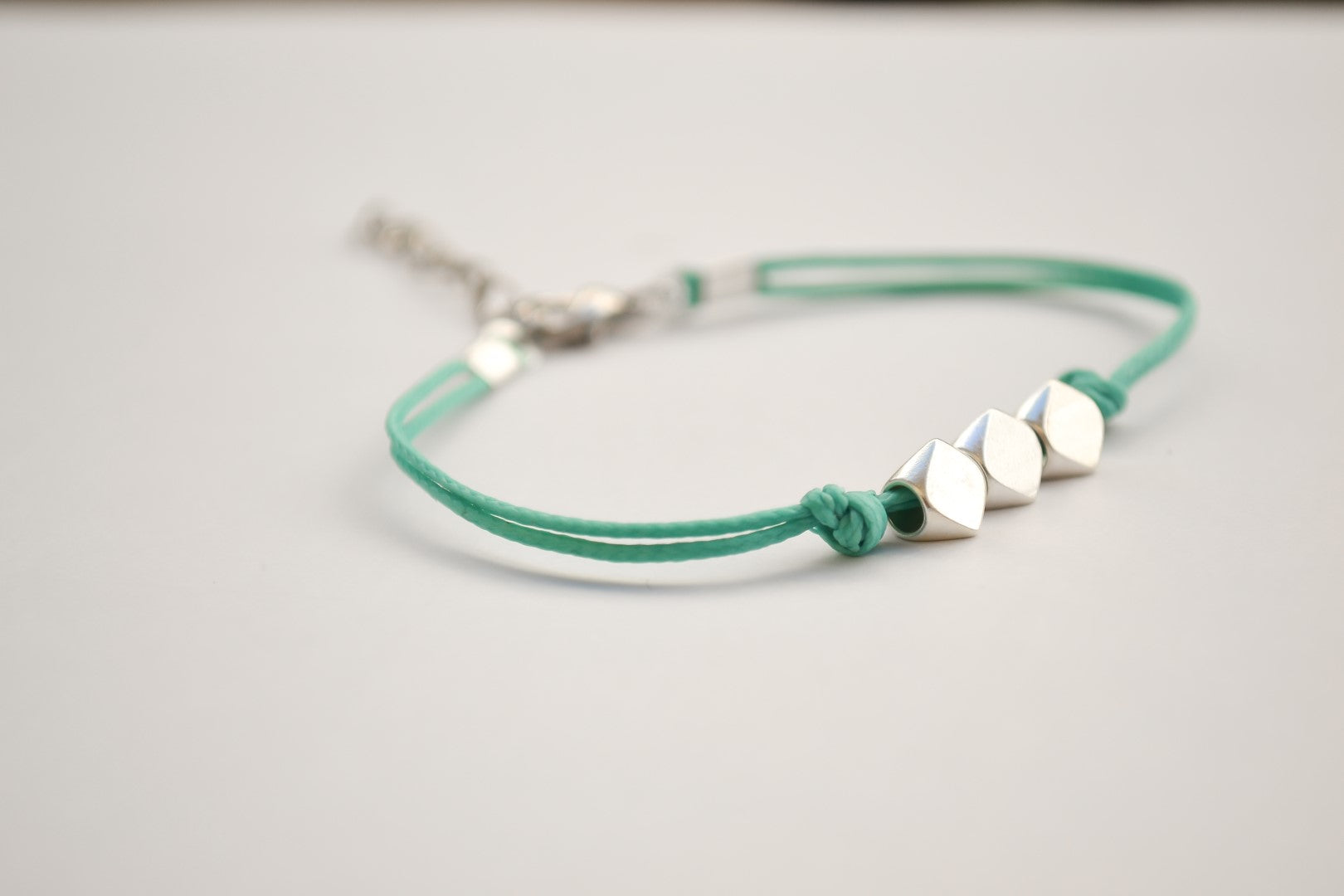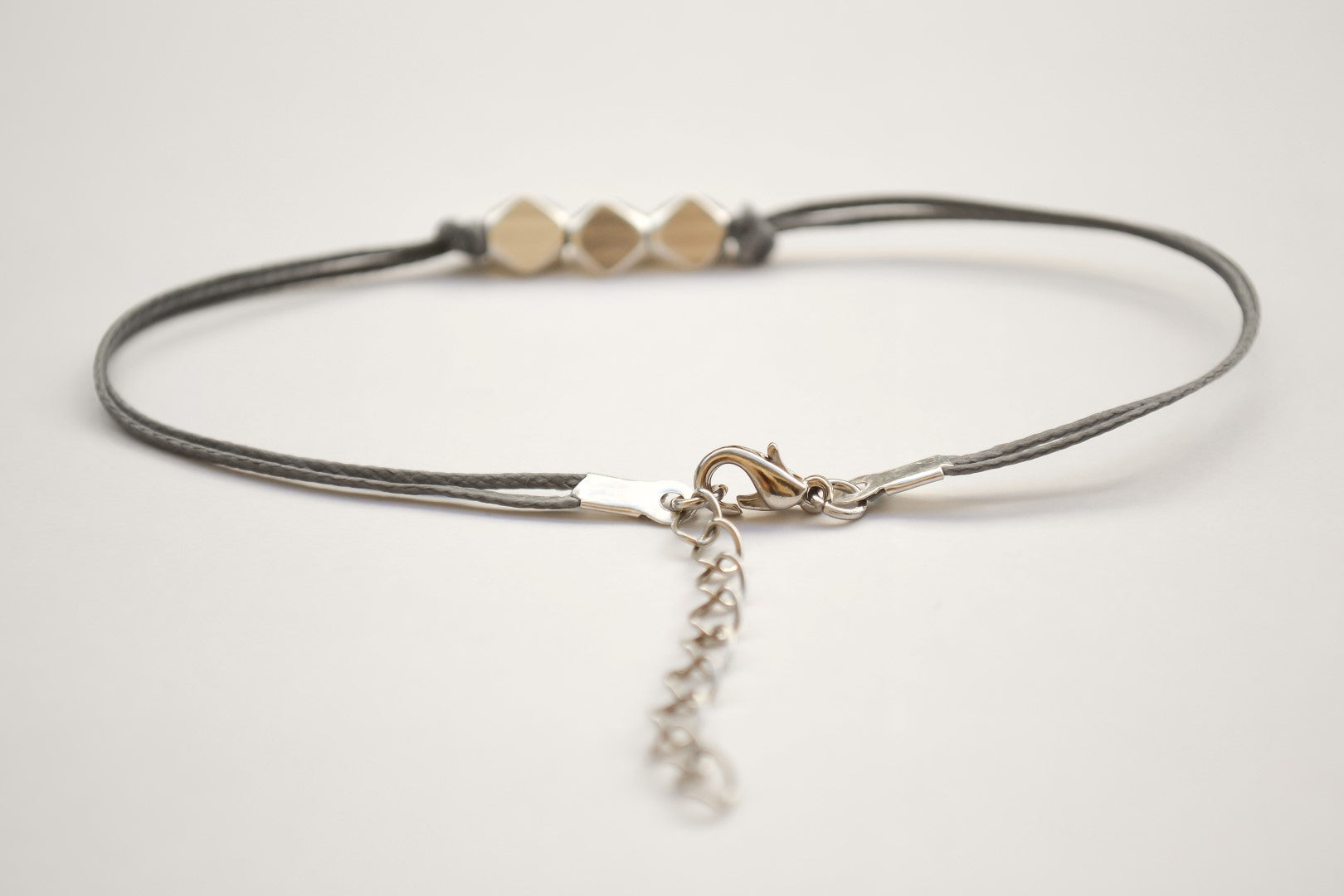 Silver nuggets anklet - cord ankle bracelet with three matt silver plated nugget beads. The cord is gray and made of cotton and the charm is silver plated. The anklet comes with an extension so it is adjustable. Clasp closure. You can request a different cord color from the colors shown in the last picture. ***this listing is for one anklet***
